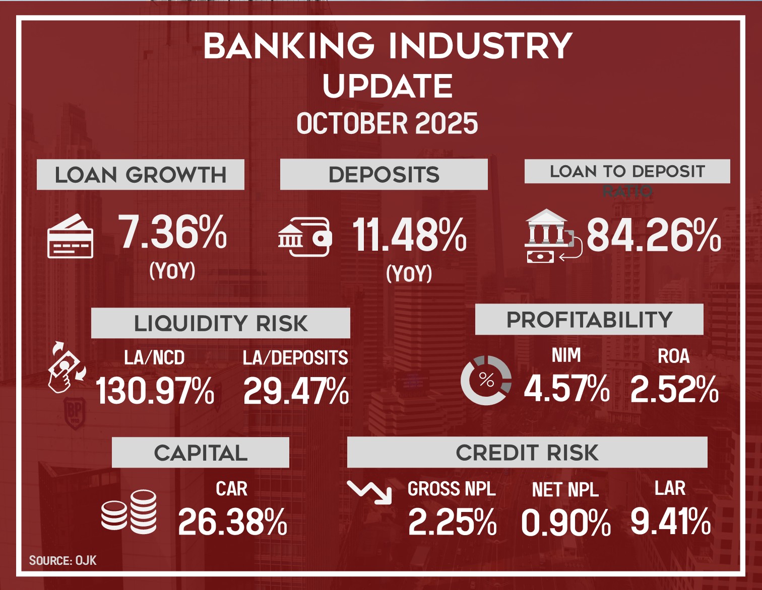 In line with improving global economic performance, the Indonesian banking sector continued to post solid loan growth, rising by 7.36% yoy in October 2025, supported by investment loans (15.72% yoy). Meanwhile, Deposits grew by 11.48% yoy, primarily contributed by demand deposits (15.53% yoy), resulting in a Loan to Deposit Ratio (LDR) of 84.26%.