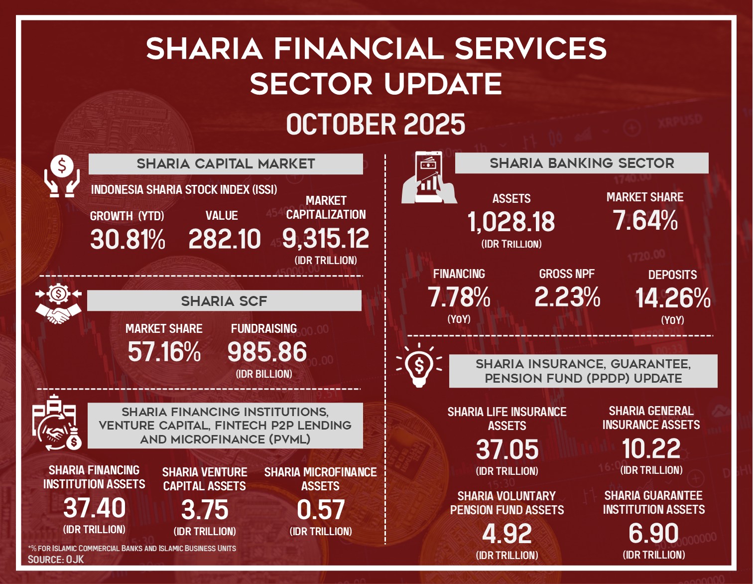As of October 2025, the Indonesian Sharia financial services sector continued to develop across all major segments. The Indonesia Sharia Stock Index stood at 282.10 points, with a year-to-date performance of 30.81% and a market capitalization of IDR?9,315.12.