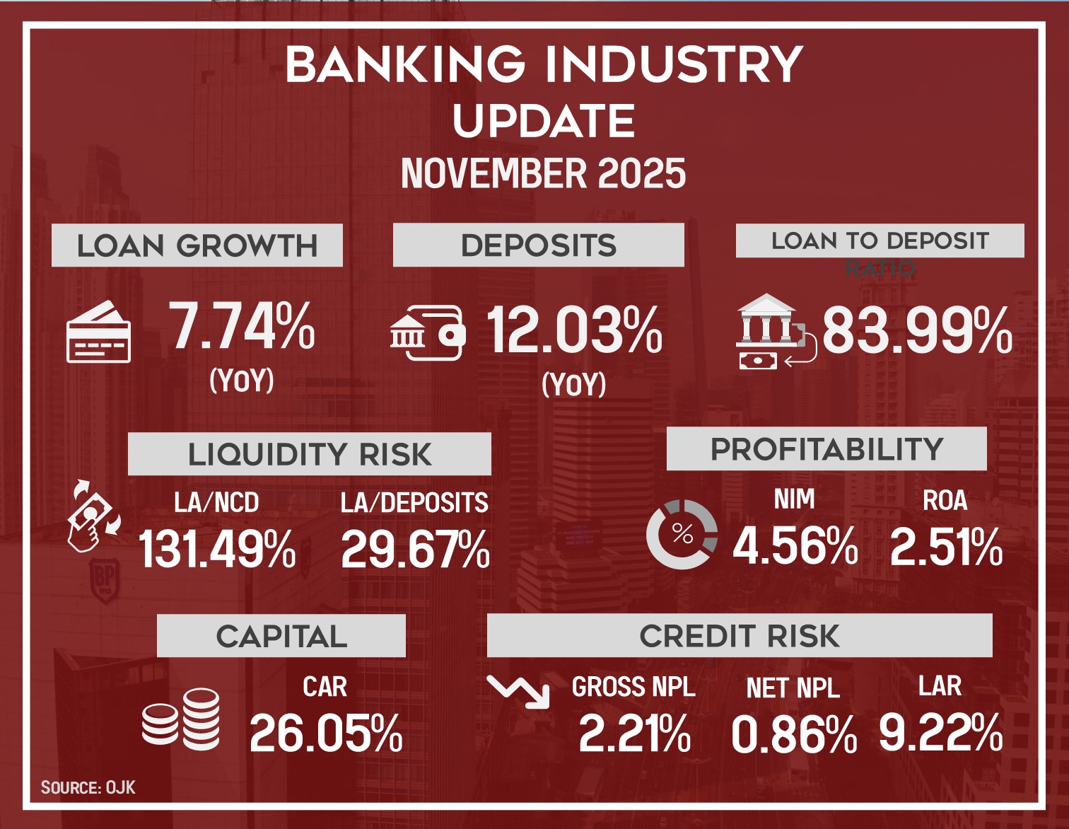 In line with improving global economic performance, the Indonesian banking sector continued to post solid loan growth, rising by 7.74% yoy in November 2025, supported by investment loans (17.98% yoy). Meanwhile, Deposits grew by 12.03% yoy, primarily contributed by demand deposits (14.15% yoy), resulting in a Loan to Deposit Ratio (LDR) of 83.99%.