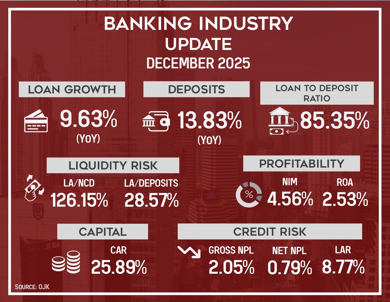 In line with improving global economic performance, the Indonesian banking sector continued to post solid loan growth, rising by 9.63% yoy in December 2025, supported by investment loans (20.81% yoy). Meanwhile, Deposits grew by 13.83% yoy, primarily contributed by demand deposits (19.13% yoy), resulting in a Loan to Deposit Ratio (LDR) of 85.35%.