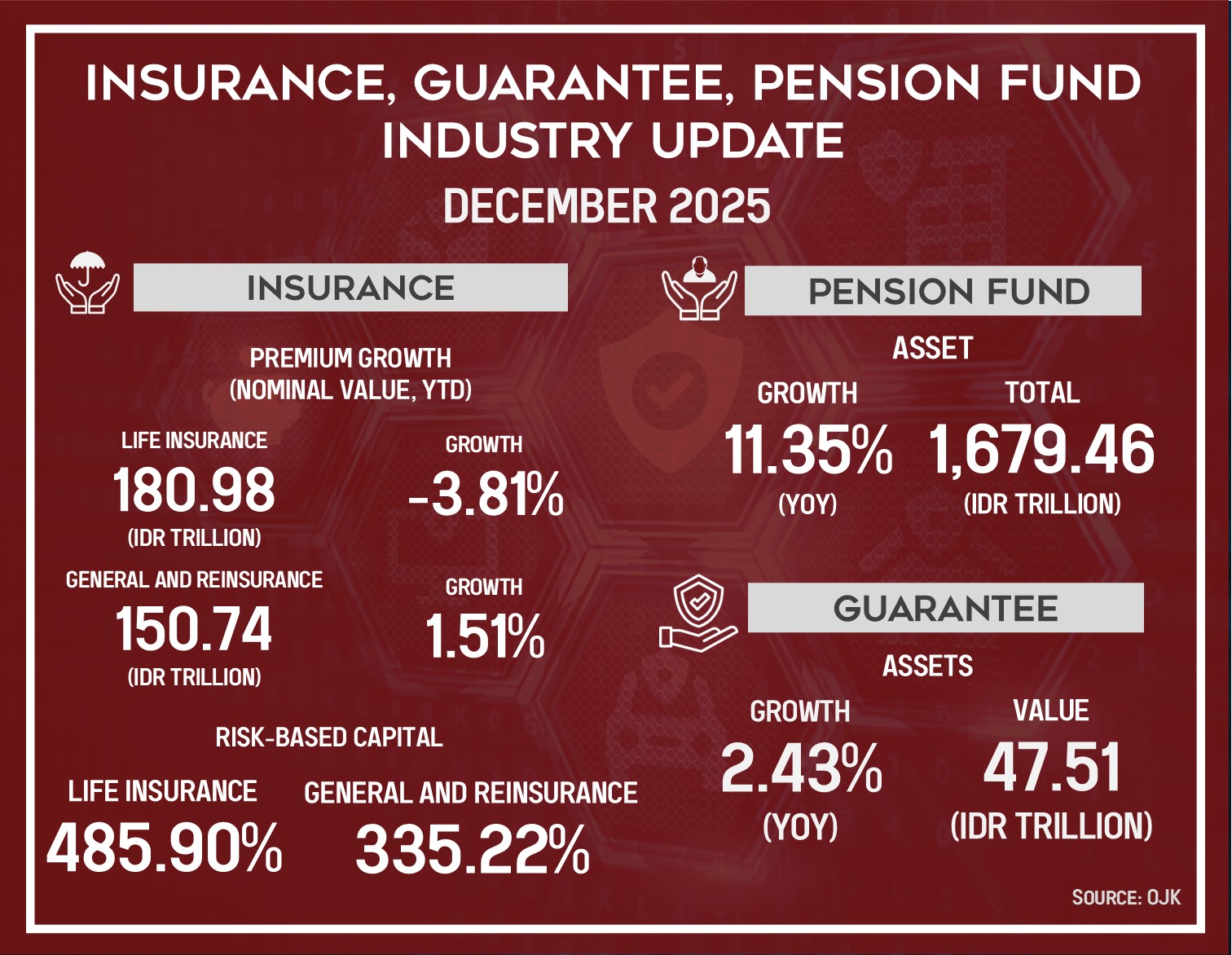 As of December 2025, the life insurance industry recorded a YTD accumulated premiums of IDR180.98 trillion, while general and reinsurance premiums reached IDR150.74 trillion. These figures indicate a relatively stable performance in the insurance sector, supported by solid capital adequacy. The Risk-Based Capital (RBC) ratio for life insurance stood at 485.90%, while general and reinsurance posted an RBC ratio of 335.22%, both significantly above the required threshold of 120%.