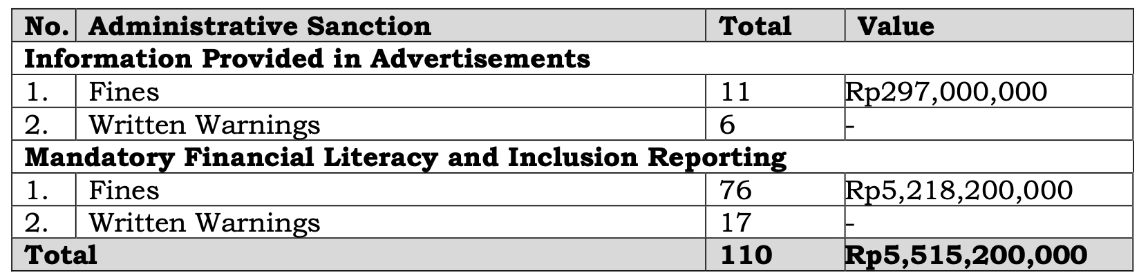 Enforcing PMDK regulations in August 2025, OJK imposed administrative sanctions in the form of fines against violations of prevailing PMDK laws totalling IDR4,030,800,000 on 10 entities, alongside two written warnings and two written reprimands.